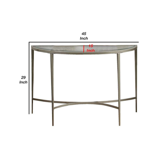 Semicircular Glass Top Sofa Table With Sleek Ta... Semicircular Glass Top Sofa Table With Sleek Tapered Legs, Silver By Benzara
