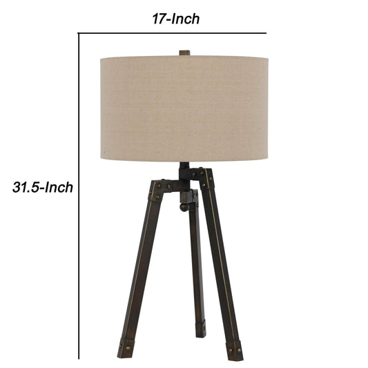 Metal Tripod Base Table Lamp With Fabric Drum S... Metal Tripod Base Table Lamp With Fabric Drum Shade, Bronze And Beige By Benzara