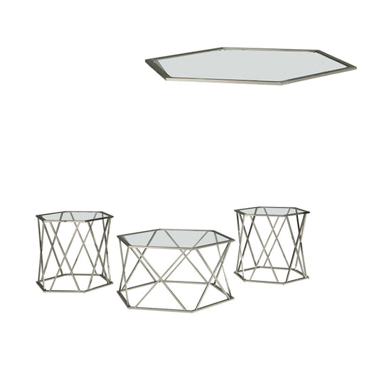 Hexagonal Design Metal Framed Table Set With In... Hexagonal Design Metal Framed Table Set With Inserted Glass Top, Set Of Three, Silver And Clear By Benzara