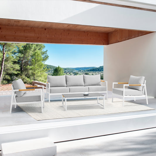 Royal 4 Piece White Aluminum and Teak Outdoor S... Royal 4 Piece White Aluminum and Teak Outdoor Seating Set with Light Gray Cushions By Armen Living