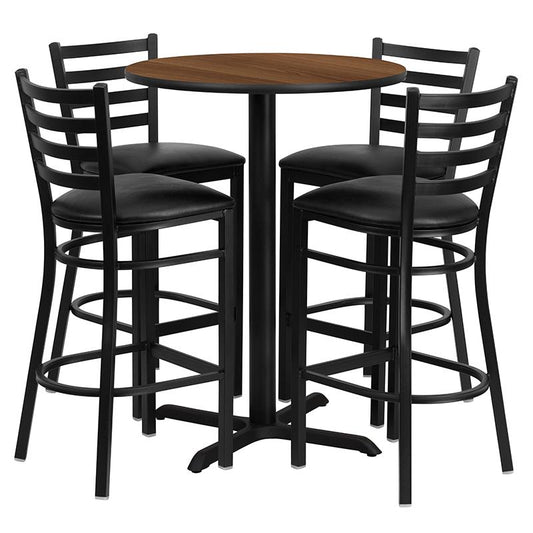 30'' Round Walnut Laminate Table Set With X-Bas... 30'' Round Walnut Laminate Table Set With X-Base And 4 Ladder Back Metal Barstools - Black Vinyl Seat By Flash Furniture