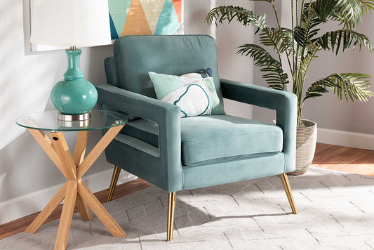 Baxton Studio Leland Glam and Luxe Light Blue V... Baxton Studio Leland Glam and Luxe Light Blue Velvet Fabric Upholstered and Gold Finished Armchair