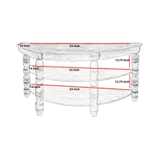 Half Moon Shaped Wooden Console Table With 2 Sh... Half Moon Shaped Wooden Console Table With 2 Shelves And Turned Legs, Gray By Benzara