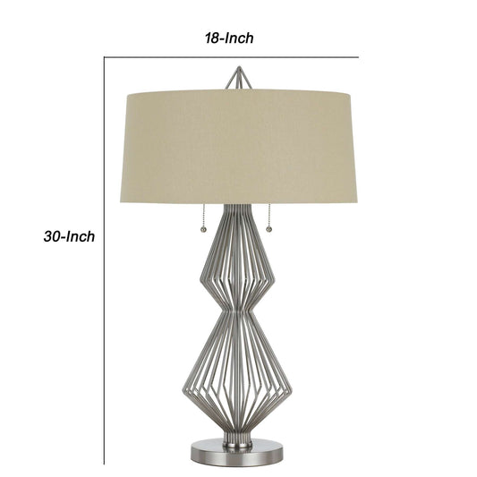 Geometric Body Metal Table Lamp With Fabric Dru... Geometric Body Metal Table Lamp With Fabric Drum Shade, Silver And Beige By Benzara