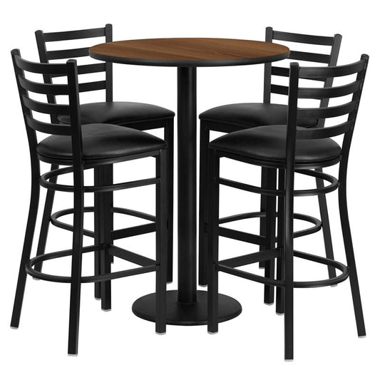 30'' Round Walnut Laminate Table Set With Round... 30'' Round Walnut Laminate Table Set With Round Base And 4 Ladder Back Metal Barstools - Black Vinyl Seat By Flash Furniture