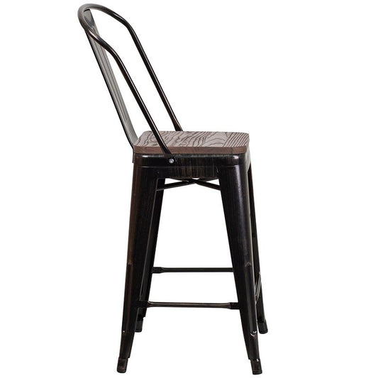 24" High Black-Antique Gold Metal Counter Heigh... 24" High Black-Antique Gold Metal Counter Height Stool With Back And Wood Seat By Flash Furniture
