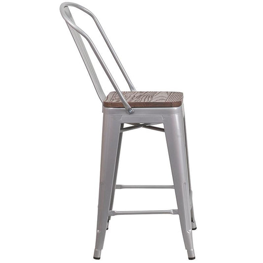 24" High Silver Metal Counter Height Stool With... 24" High Silver Metal Counter Height Stool With Back And Wood Seat By Flash Furniture