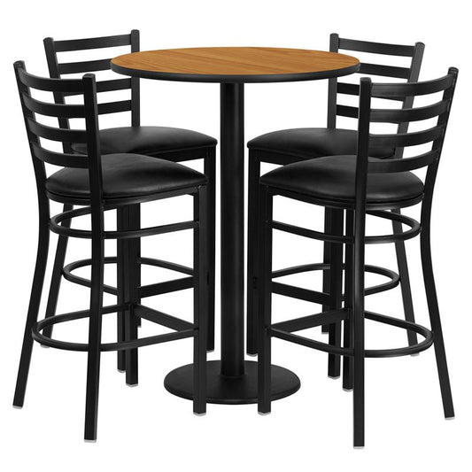 30'' Round Natural Laminate Table Set With Roun... 30'' Round Natural Laminate Table Set With Round Base And 4 Ladder Back Metal Barstools - Black Vinyl Seat By Flash Furniture