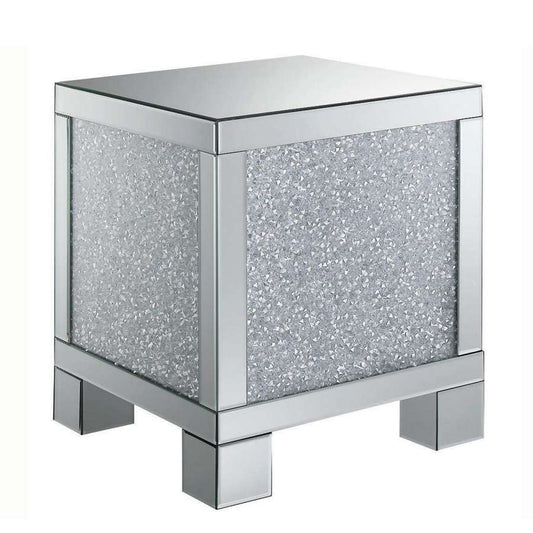 Wooden End Table With Infused Crystals On Mirro... Wooden End Table With Infused Crystals On Mirrored Panel, Silver And Clear By Benzara