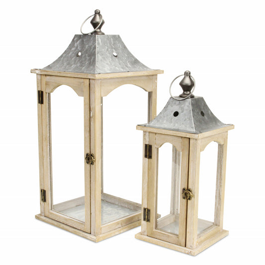 Set of 2 Brown Wood finished Frame Glass and Me... Set of 2 Brown Wood finished Frame Glass and Metal Top Lanterns By Homeroots