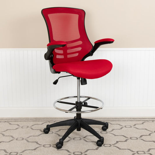 Mid-Back Red Mesh Ergonomic Drafting Chair With... Mid-Back Red Mesh Ergonomic Drafting Chair With Adjustable Foot Ring And Flip-Up Arms By Flash Furniture