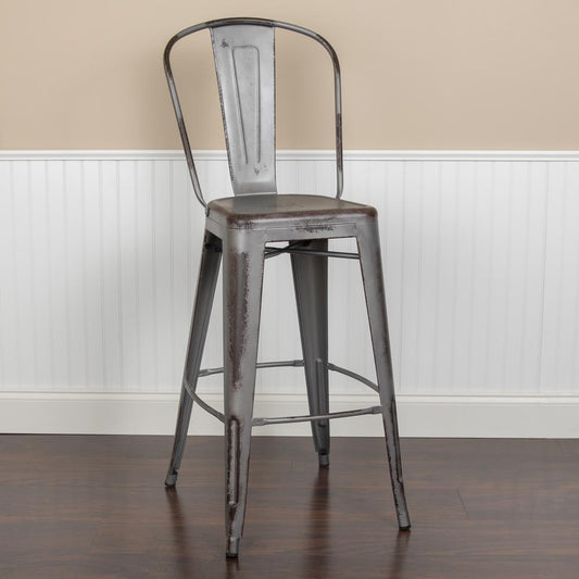Commercial Grade 24" High Distressed Silver Gra... Commercial Grade 24" High Distressed Silver Gray Metal Indoor-Outdoor Counter Height Stool With Back By Flash Furniture