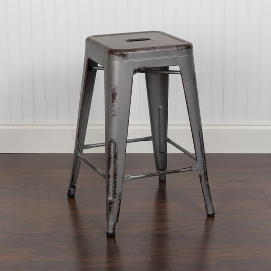 Commercial Grade 24" High Backless Distressed S... Commercial Grade 24" High Backless Distressed Silver Gray Metal Indoor-Outdoor Counter Height Stool By Flash Furniture