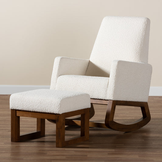 Baxton Studio Yashiya Mid-Century Modern Off-Wh... Baxton Studio Yashiya Mid-Century Modern Off-White Boucle Upholstered and Walnut Brown Finished Wood 2-Piece Rocking Chair and Ottoman Set