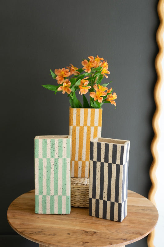 Set Of Three Clay Rectangle Striped Vases By Ka... Set Of Three Clay Rectangle Striped Vases By Kalalou