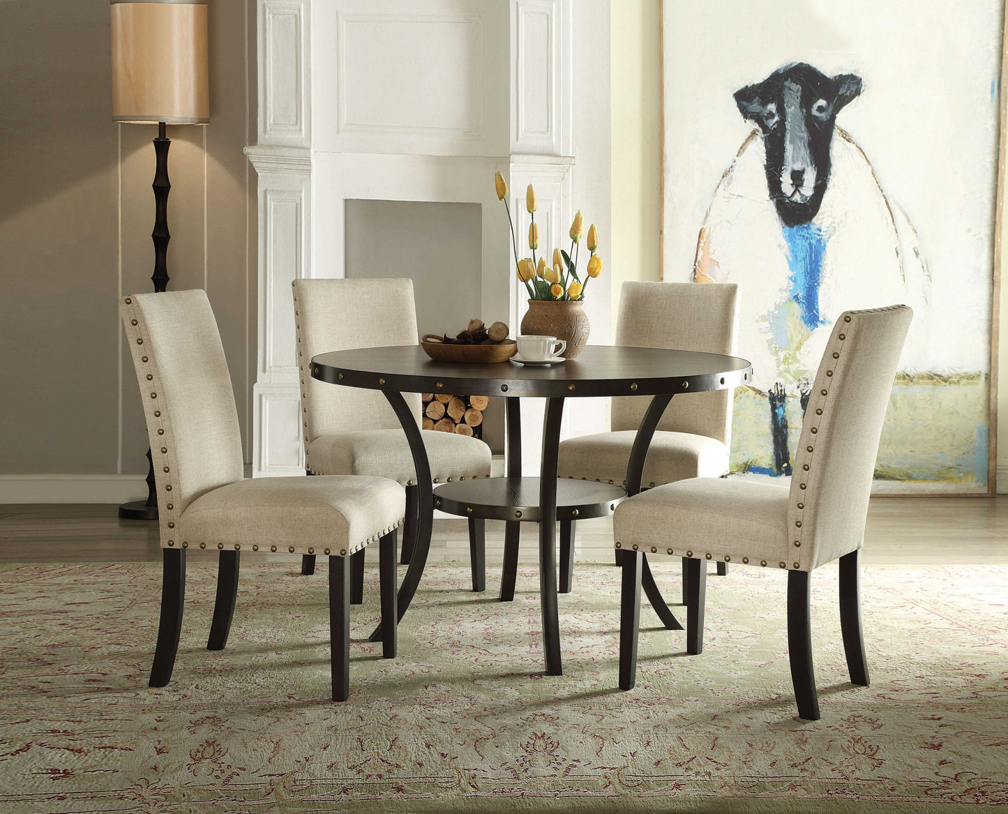 Take your dining experience to another level of entertaining with this contemporary styled side chair. It is elegantly constructed to add spice and inspiring visual vibes to your exquisite dining area. Featuring a fully padded seat and backrest with nail-head trim in light beige fabric, our luxurious side chair will greatly transform the look of your room. The walnut finished wooden tapered legs give maximum support to the sumptuously padded seat meant for your sole comfort and enjoyment.