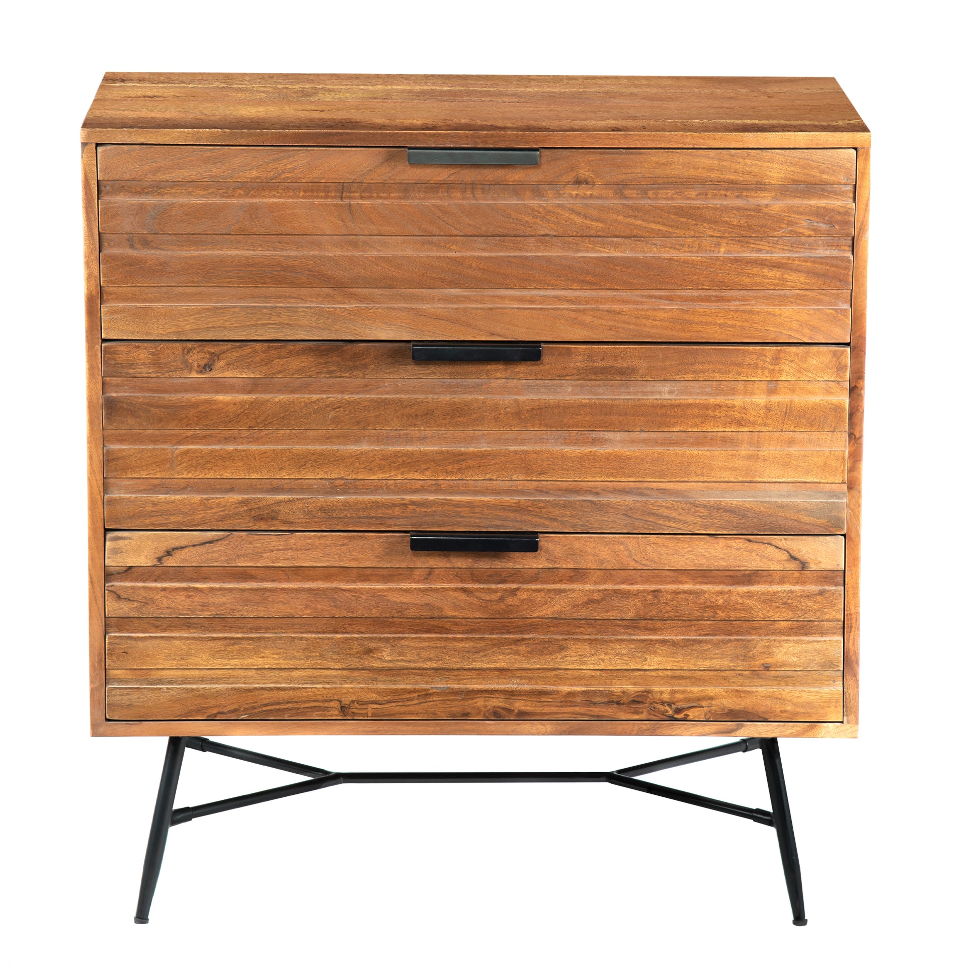 Your search for a compact yet spacious furniture will end with this transitional style chest that easily blends with a variety of ensembles. Constructed using acacia wood and metal base, it features three spacious drawers attached with metal fingertip handles and accented with slatted design front. The aesthetically visible wood grain details adds to its charm, making it an appealing piece of furniture for every home. Due to the handcrafted nature of the product, there may be variation in color, finish, wood grain and knots.