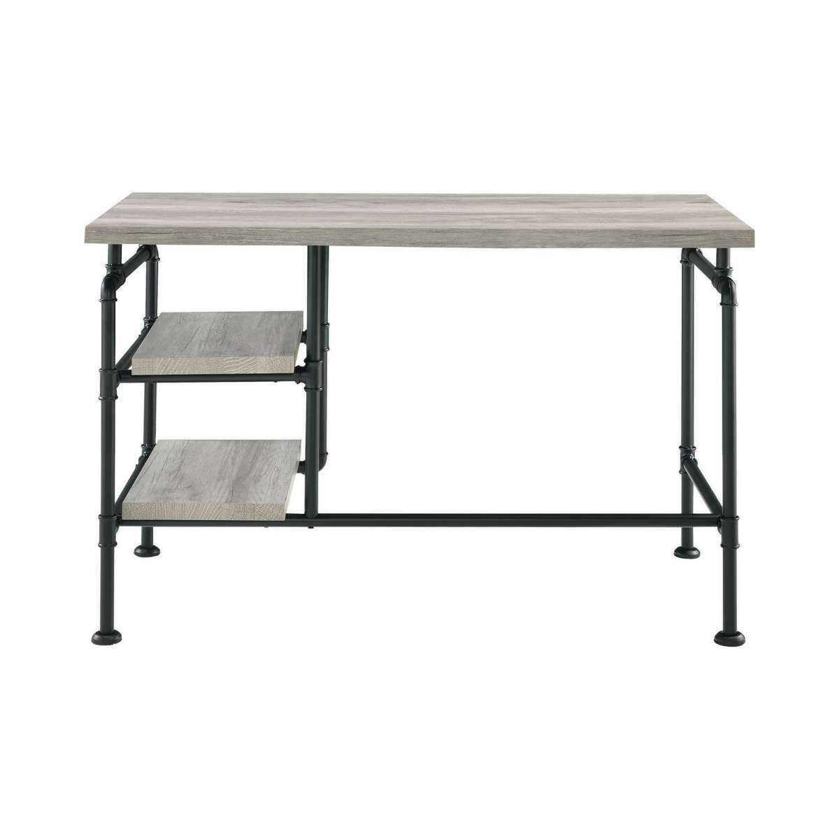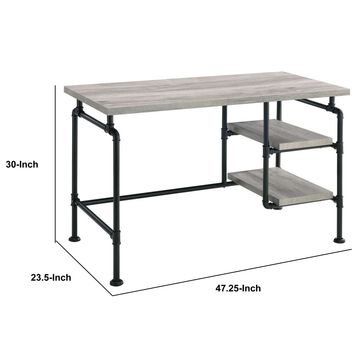 Work conveniently at your home or office by the inclusion of this amazing writing desk. Featuring a tubular pipe design metal frame in a black finish, it incorporates a wooden tabletop and 2 wooden shelves in a gray finish, granting a dual tone look. It is supported by tubular legs, granting stability and durability.