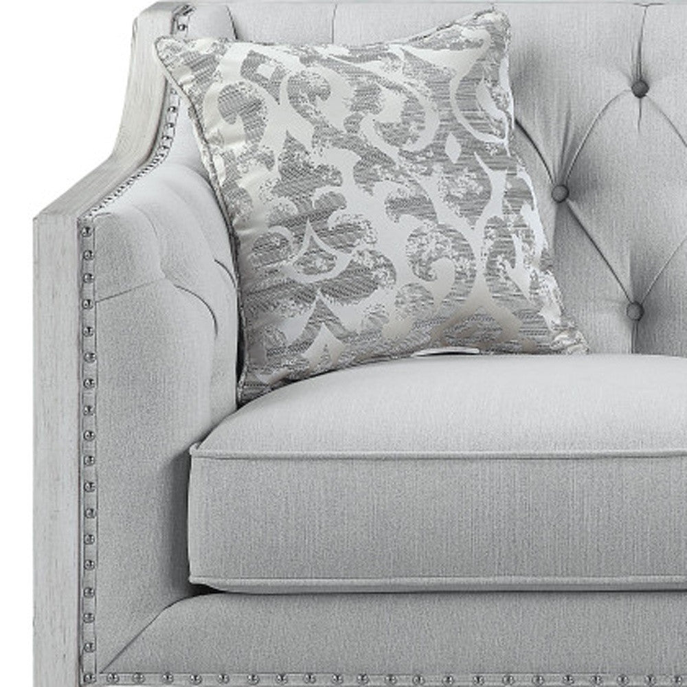 Add An Air Of Fashion To Your Space With This Fabulous 61-Inch Light Gray And Off White Love Seat And Toss Pillows. Square Arms Offer A Comfy Place To Rest And Give This Piece Some Interest And Shape. A Great Showpiece For Your Room, This Sofa Is A Must Have. 32-Inch H X 61-Inch W X 35-Inch D