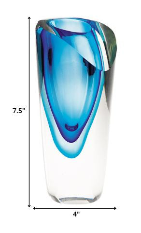 Parade your superb flowers and differentiate your space with this alluring vase. This vase is made of high grade glass and will be with you for quite a while. Additionally, its entrancing blue color and beguiling style will augment and complement your shelves and surfaces and amplify the aesthetic of your rooms. There is no better adornment for your rooms than this vase. Its components are all natural and environmentally sustainable. Its height is 7.5”, and its width is 4”. Its depth is 4”, and it weighs 7 pounds. This vase has uniquely layered, thick walled art glass. Colors may also vary from piece to piece, making each one a unique work of art. It’s both visually charming and functional, and would make a commendable gift as well.