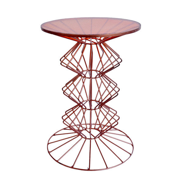 Update the look of your den or living room with the Orianne Ornate Copper Side Table. This unique side table features a wire frame base with an antique copper finish and a round glass table top.