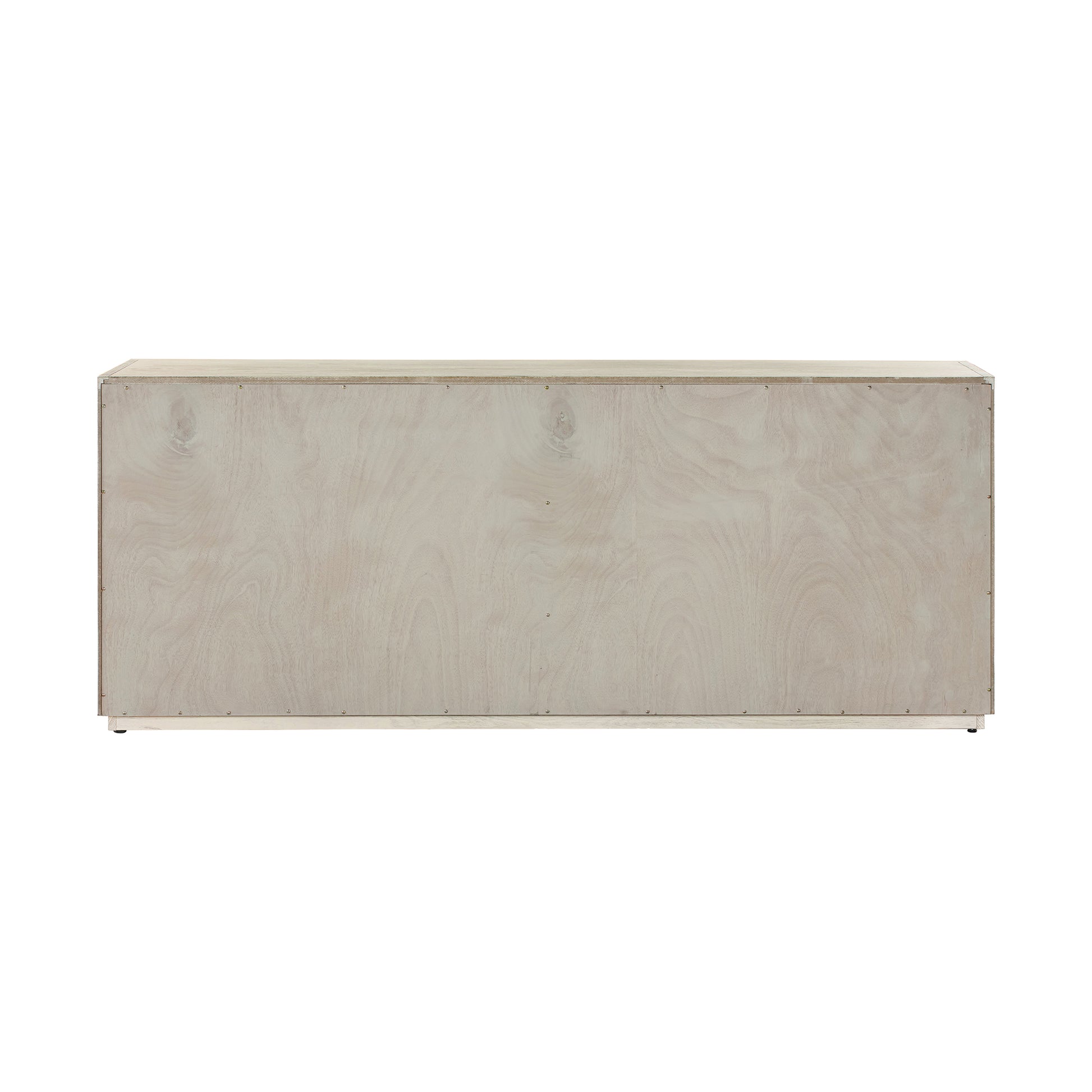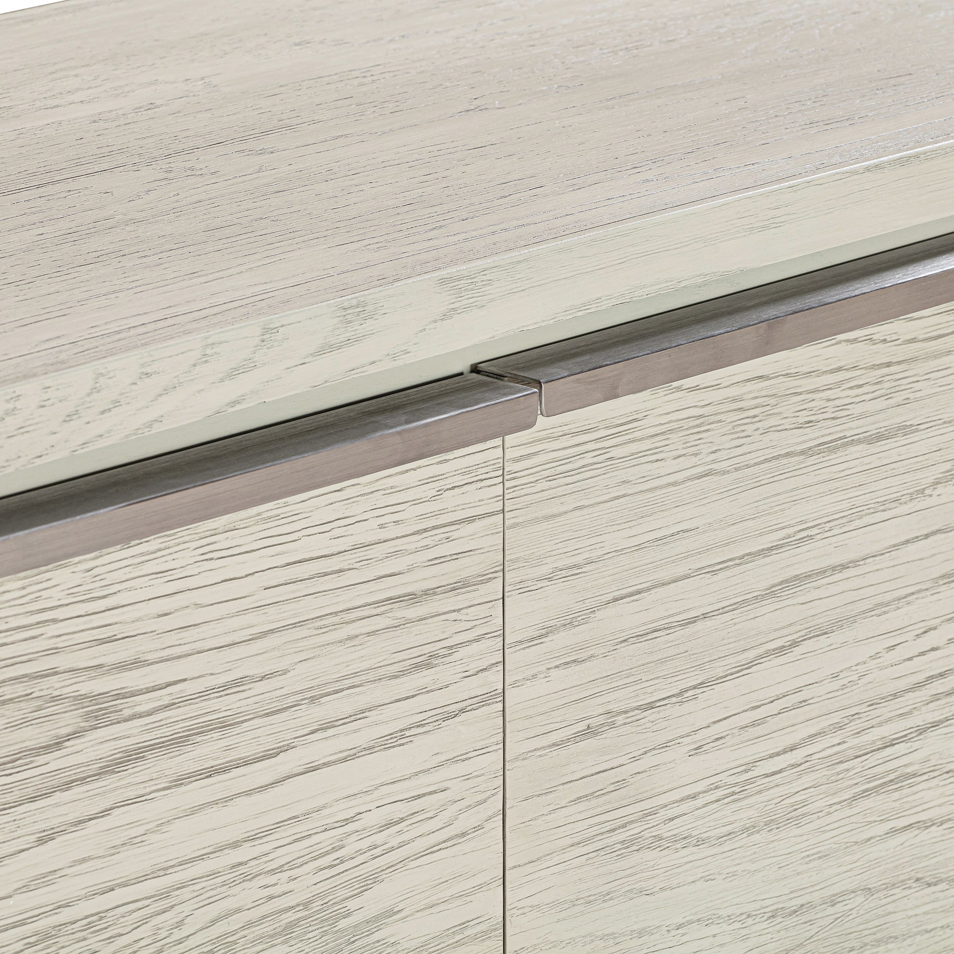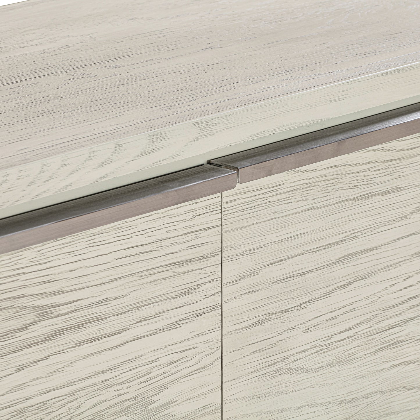 Add stylish and functional storage solution to your home with Abbey silver grey oak 4 door sideboard and buffet. The modern and streamlined look of the sideboard allows focusing on the rich organic grains of Oak. Completed with a sleek silver-grey finish, the sideboard can bring effortless style to any dead corner of your home. The Abbey features brushed stainless steel handles that complement this dining room console cabinet. With a timeless and versatile design, our 4-door sideboard can easily transition from a buffet to a media, office cabinet, or entryway storage unit. Oak is a highly durable hardwood used for thousands of years. It has a unique grain pattern derived from the rings of the oak tree. It contains high levels of tannins, allowing the wood to resist insects, mold, and fungus naturally. This serving buffet features plenty of storage with its 4 doors and shelves to become your perfect entertaining companion at brunches and holiday.