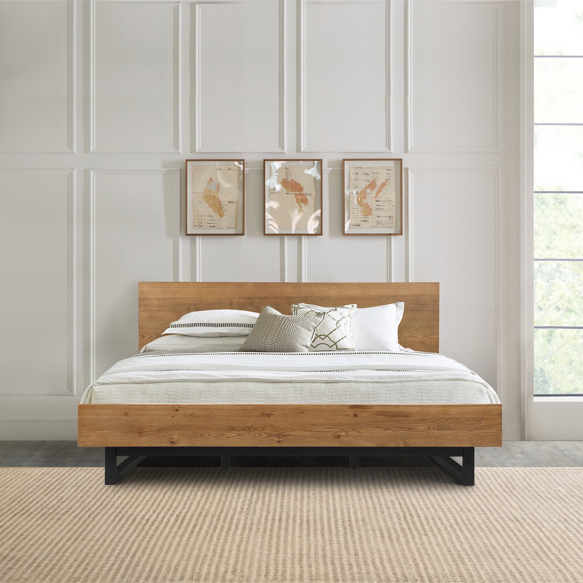 Aldo King Size Brown Oak Wood Platform Bed Frame with Black Metal Legs By Armen Living