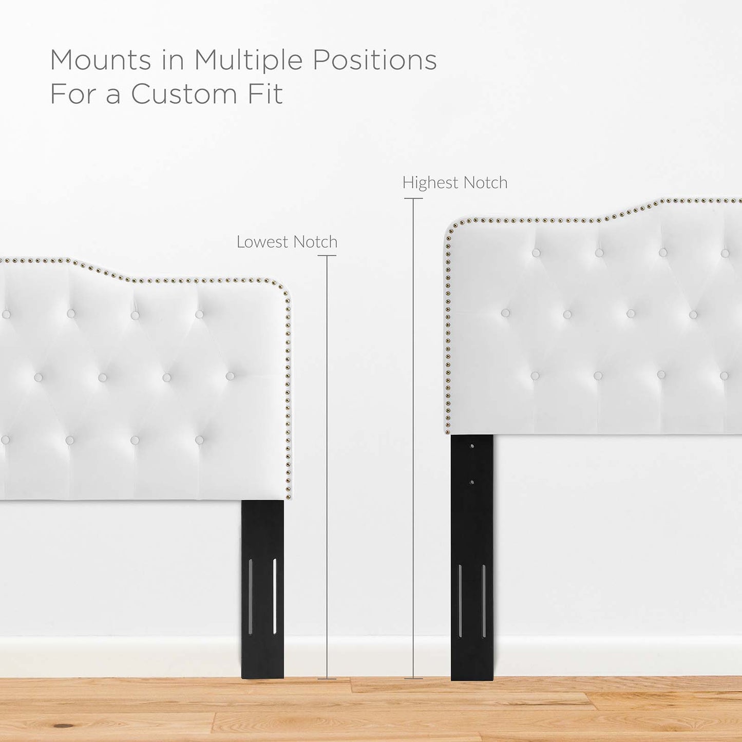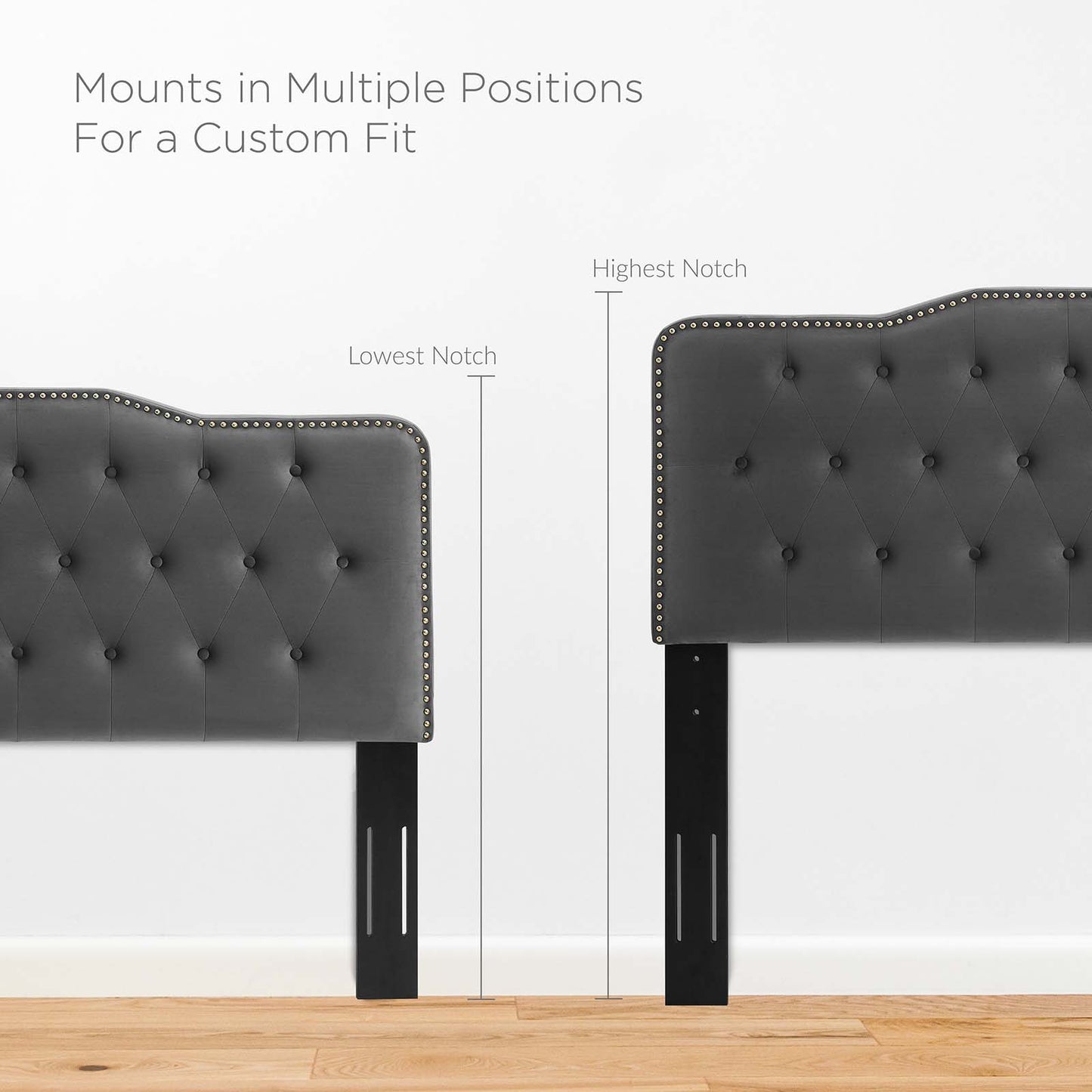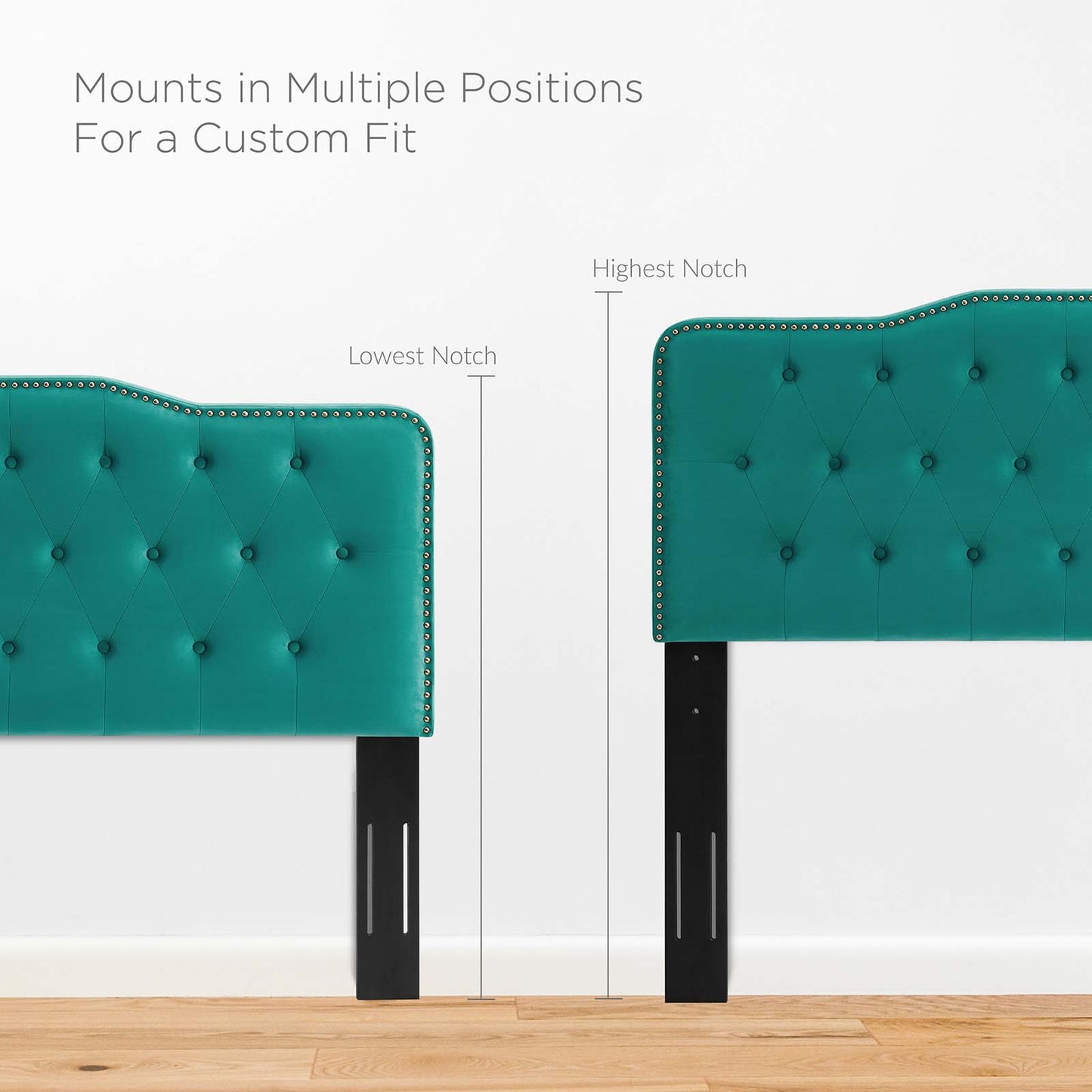Refresh a teenager's bedroom or guest bedroom with the glam deco style and vintage modernity of the Amber Performance Velvet Full Platform Bed. Adorned with classic button tufting and framed with nailhead trim, the full headboard of this platform bed features a charming silhouette. Covered in stain-resistant performance velvet, the padded headboard creates a supportive place to rest and relax while sitting up in bed. This upholstered bed frame is a sturdy mattress foundation for memory foam, innerspring, latex, and hybrid mattresses. Eliminating the need for a box spring, the MDF frame of this full bed is complete with a wood slat support system crafted with poplar for lasting durability and support. This slatted bed frame rests on wood legs with gold metal sleeves and non-marking foot caps and includes a reinforced center beam with two support legs for enhanced stability. Assembly required. Weight Capacity: 800 lbs.
