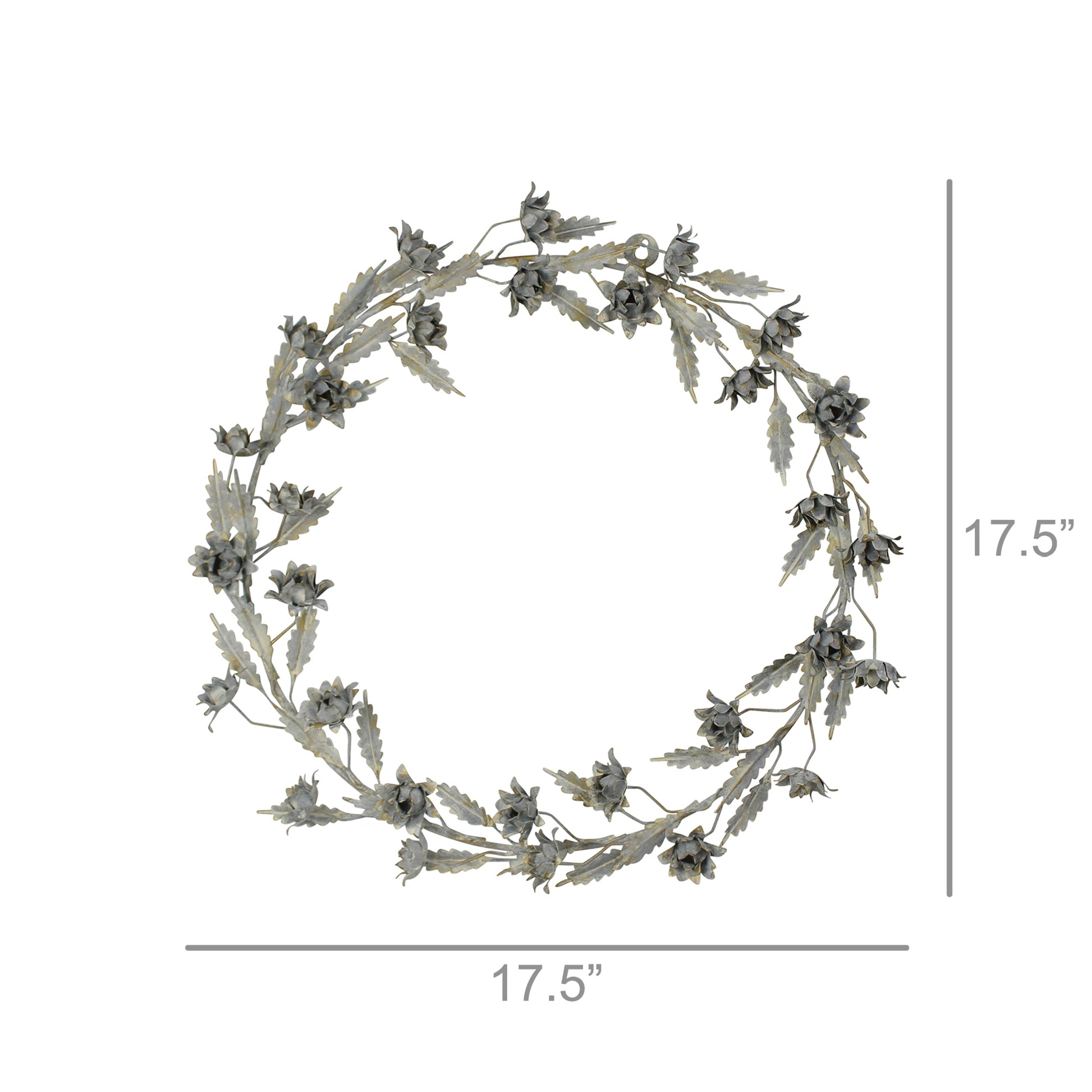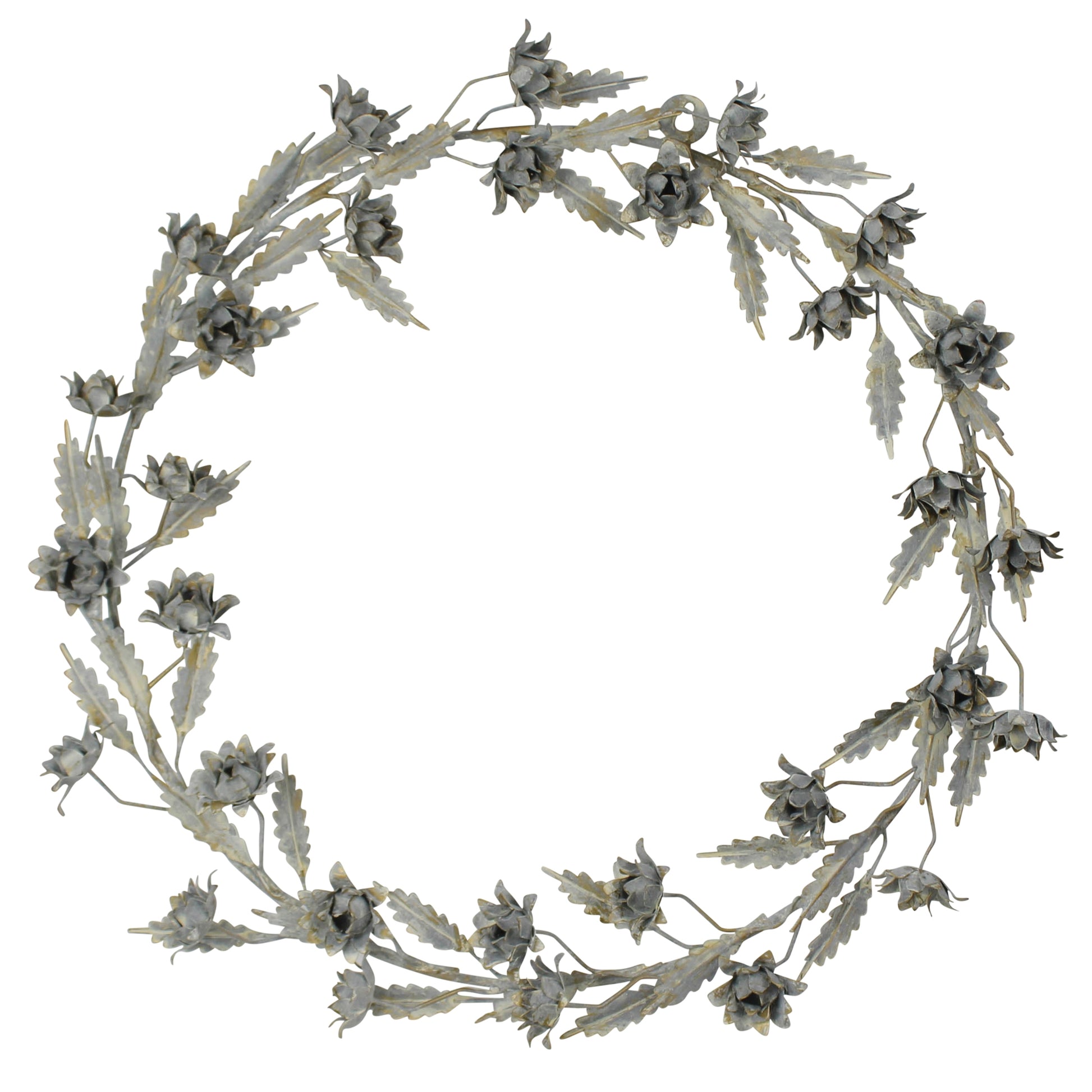 An everlasting statement piece that looks gorgeous on a door frame, above the fireplace, or even as a table centerpiece. Crafted of iron with pressed metal flowers and leaves. Whitewash finish may patina or rust if left outdoors.
