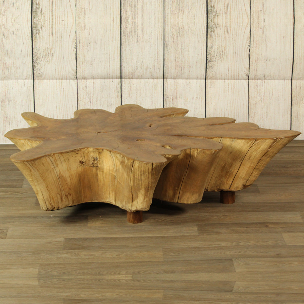 Carved out from a massive, ancient teak tree in Java Islands, this solid slab coffee table is striking, modern, and organic. The fluid lines of the edges, the irregular shape of the trunk and the table surface showing the knots, rings and wood grain has been left intact in all its glory. A breathtaking piece of natural history, this reclaimed wood coffee table is one of a kind in this world.