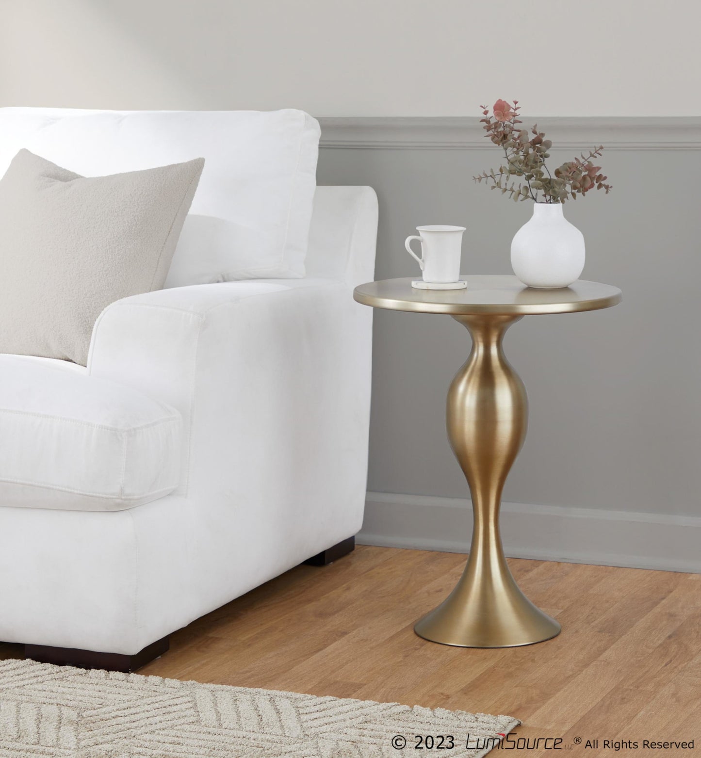 The Ashland Accent Table from Grandview Gallery by LumiSource perfectly balances modern flair and minimalism with its clean lines and eye-catching curves. The table's bold round base curves up into a lovely hourglass silhouette and is crowned by a matching circular tabletop. This is the ideal end table for those seeking modern design with the allure of seamless perfection.