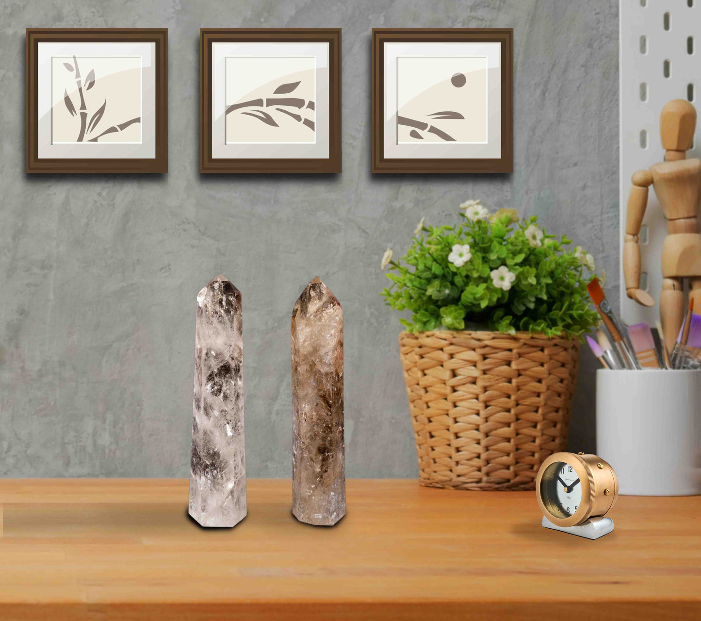 This particularly striking form of naturally transparent and luminous quartz from Brazil has beautiful, unusual inclusions and color variations. These grand obelisks are cut to follow the lines of natural hexagonal quartz crystals and polished to a high shine, revealing the unique colorations and intricacies in each one.