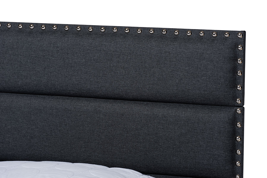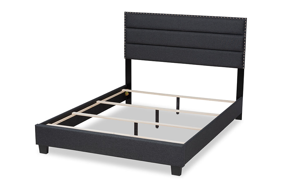 Anchor your bedroom in style and comfort with the Ansa bed. Built with a sturdy wood frame, the Ansa is upholstered in a soft, foam filled polyester fabric that provides ample comfort for you to rest against. Channel tufting adds a clean, modern look, while silver nailheads lend a touch of glamour. Black tapered legs complete the look. A box spring is required for use. The Ansa bed is made in Malaysia and requires assembly.