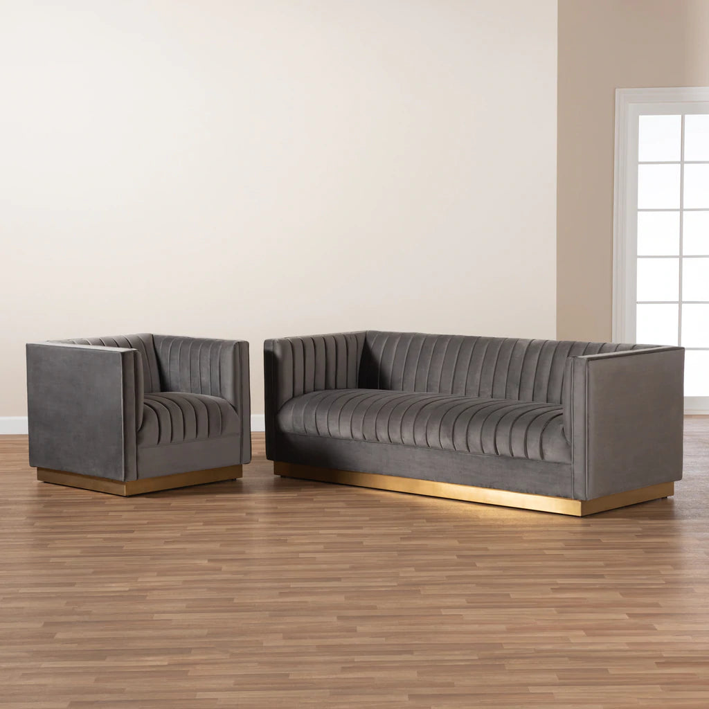 Baxton Studio Aveline Glam and Luxe Grey Velvet Fabric Upholstered Brushed Gold Finished 2-Piece Living Room Set