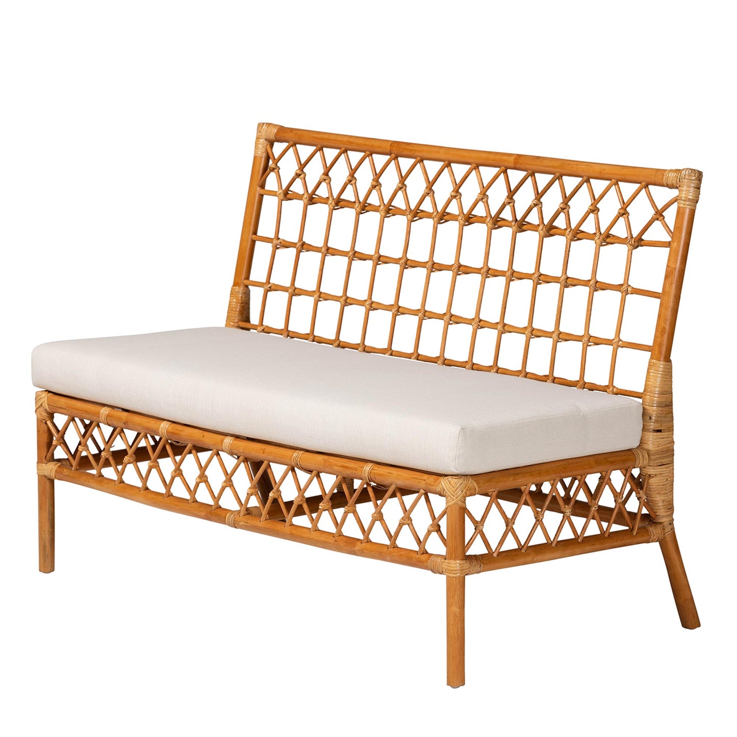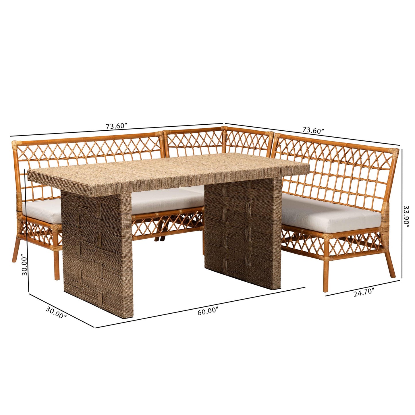 An air of exotic bliss permeates the mood of every meal with the lovely Abella dining nook set. Made in Indonesia, this bohemian set includes two benches, one corner seat, and one table. Each seat features a handcrafted rattan frame topped with plush cushions upholstered in lavish fabric for superb comfort. The Abella will arrive fully assembled and features a broad, rectangular tabletop to accommodate each member of the table. Presenting crisp geometric charm in every facet, the Abella dining nook set creates an outstanding centerpiece for any occasion. Disclaimer: Rattan is a product of nature and may have variations in areas such as, but not limited to, color, pattern, grain and texture. The hair-like strands of rattan/rattan-fiber are common due to the nature of the material.