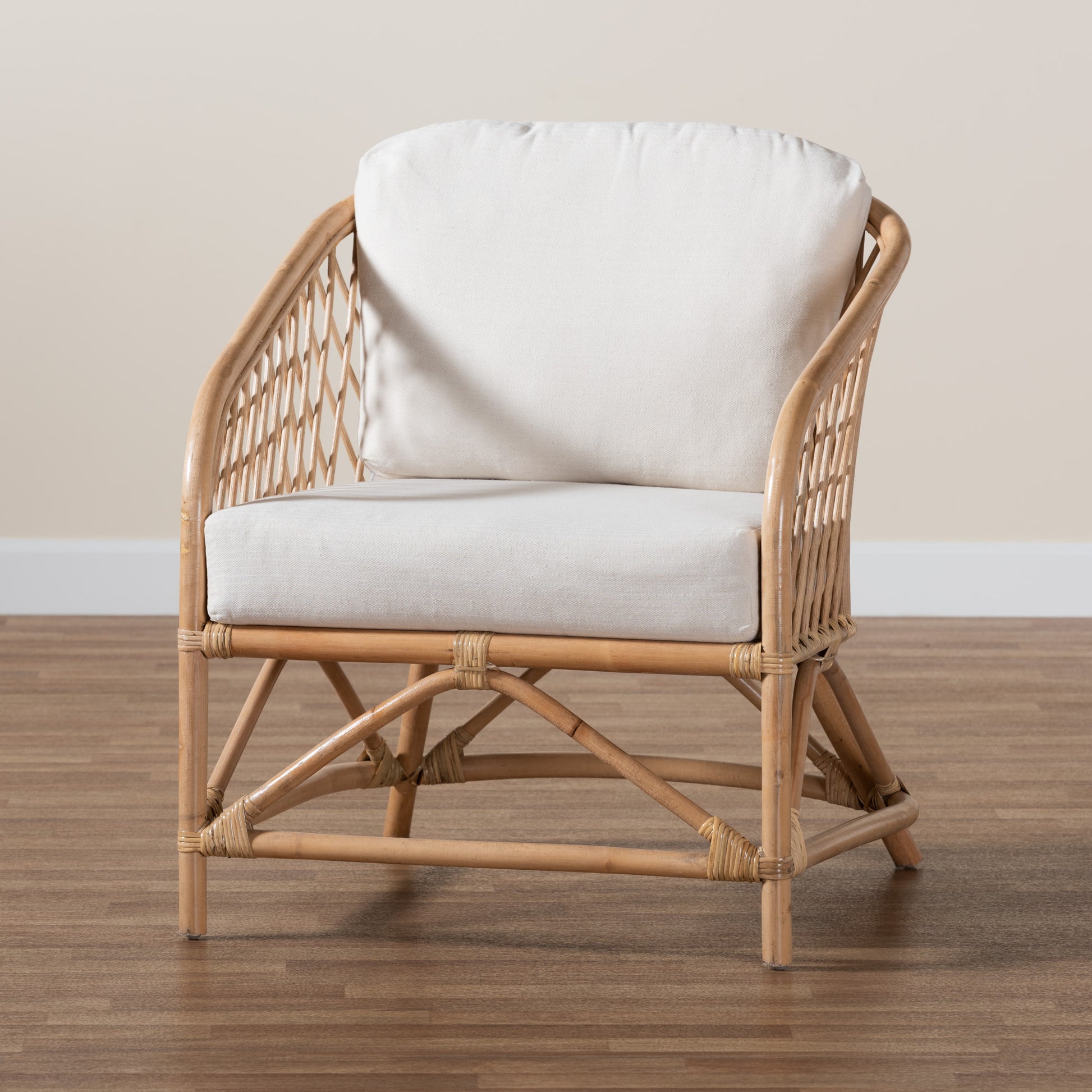 Baxton Studio bali & pari Patsy Modern Bohemian White Fabric and Natural Brown Rattan Armchair