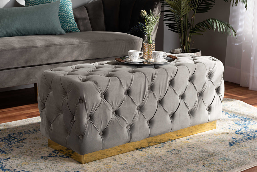 Baxton Studio Corrine Glam and Luxe Grey Velvet Fabric Upholstered and Gold PU Leather Ottoman