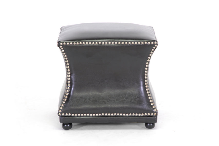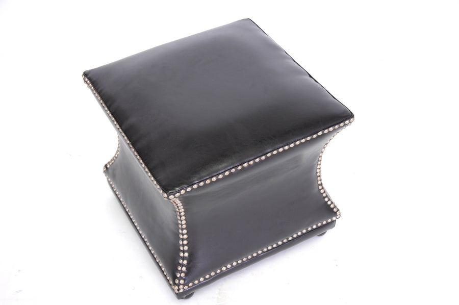 Ellastone Dark Brown Modern Leather Ottoman Looking for a twist on a basic ottoman? If so, the Ellastone Ottoman with unexpected concave sides delivers! Our modern ottoman is made with a sturdy birch wood frame, black ball legs, and CA117 flame retardant cushioning. Completing the contemporary footstool is silver nail head edging on the dark espresso brown bonded leather. Made in China, the modern ottoman is fully assembled and should be wiped clean with a dry cloth. Features: - Contemporary hassock ottoman - Dark brown bonded leather - Birch frame with black stained legs - High density polyurethane foam cushioning (CA117 flame retardant) - Silver tone metal nail head trim - Concave sides - Fully assembled - Made in China Looking for a twist on a basic ottoman? If so, the Ellastone Ottoman with unexpected concave sides delivers.
