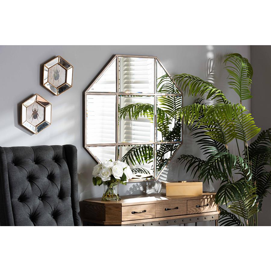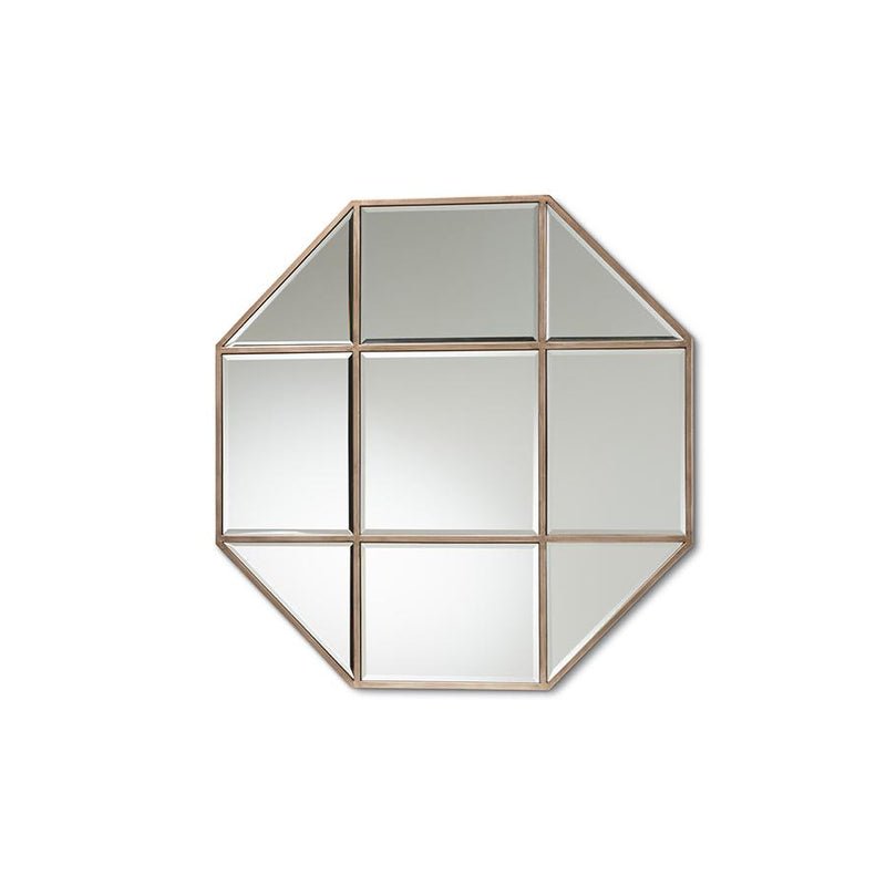 Elevate any space with the contemporary charm of the stunning Enora mirror. Made in China, the Enora features different sized mirrors embedded into a light antique bronze finished metal frame, creating a unique geometric appearance. Its crisp octagon shape lends an ultra modern feel, while the beveled edges on the mirrors provide a refined look. The mirror will arrive fully assembled and is wall mountable. Its large size is ideal for adding depth to any room, making the Enora mirror a prime way to modernize any space.