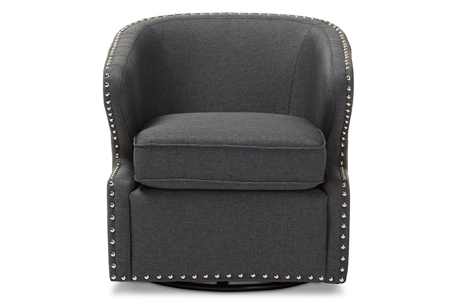 Crafted from the ground up, the Finley armchair was intentionally designed to be a piece that reflected classical shapes, offering a comforting feel of the familiar, while also challenging design concepts with it's angular armrests, edge piping and silver nail heads trim. Featuring swivel base, the Finley armchair is constructed of solid wood frame and is upholstered in beige polyester fabric. Imbuing a sense of mid-century retro modern design, the Finley armchair will work well with your modern home decor. Made in China, the swivel armchair requires minor assembly.
