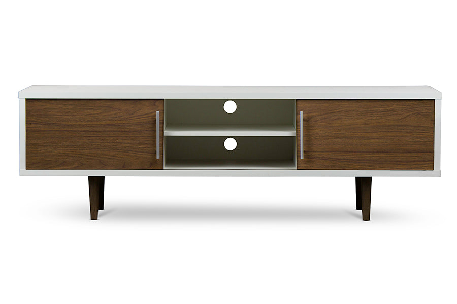 Twin tones intertwine intensely in our Gemini Wood Contemporary TV Stand. Boasting a compellingly contrasting white-and-walnut faux wood-grain paper veneer, this TV stand brings sensational styling to your entertainment center. Genuine metal sliding-door pulls and tapered black legs create a dynamic presence at a discount price.