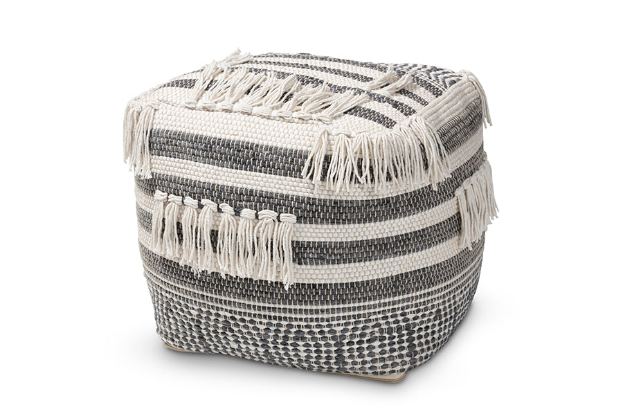 Baxton Studio Kirby Moroccan Inspired Grey and Ivory Handwoven Cotton Pouf Ottoman