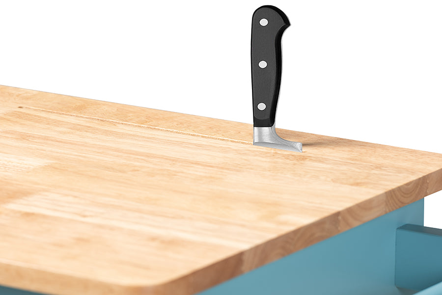 Kitchen organization is made chic and easy with the Liona cart. The Liona’s charming farmhouse-inspired design and sky blue finish add a playful, contemporary look to any kitchen. The natural-finished, solid rubberwood top is equipped with a built-in knife holder and provides ample surface space to prep and serve food. Three shelves and a drawer provide convenient storage space, while a pull-out garbage compartment makes cleanup a breeze. The Liona cart is made in Malaysia and requires assembly.
