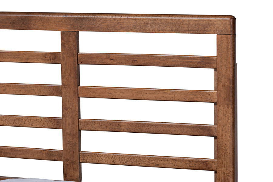 Bring depth and levity to your bedroom with the contemporary Luciana bed. The Luciana bed features a wide-set slat headboard comprised of ash walnut finished wood, ideal for providing a light and open feel in smaller spaces. Made in Malaysia, the bed includes an upholstered platform base fitted with wooden slats, eliminating the need for a box spring. The Luciana requires assembly and comes with six pre-drilled holes on the headboard to provide five unique height options for a customized setup. Bring a cozy yet stylish ambiance to any bedroom with the inviting Luciana bed.