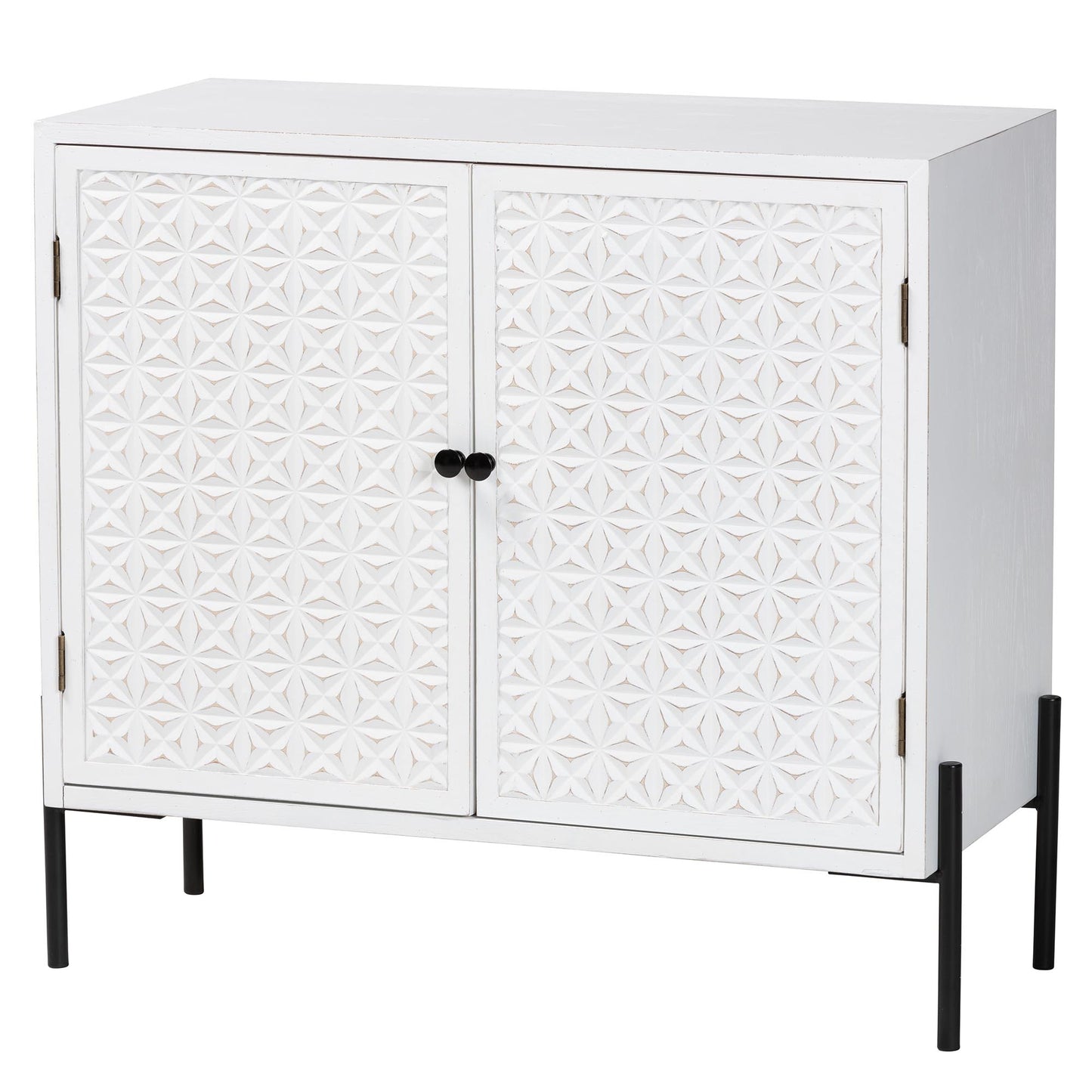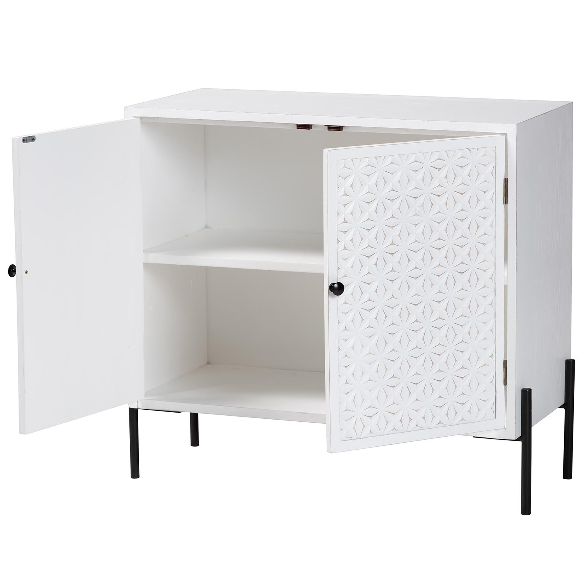 Beautify the mood of any layout with the classic charisma of the Nefeli storage cabinet. Made in China, this mid-century inspired piece consists of a sturdy wood frame fitted with solid metal legs. The doors open revealing two spacious shelves perfect for decluttering and organizing busy rooms. The Nefeli requires assembly and features carved detailing for geometric flair that highlights its round door knobs. Lending an air of grace, the Nefeli storage cabinet blends well with any layout.