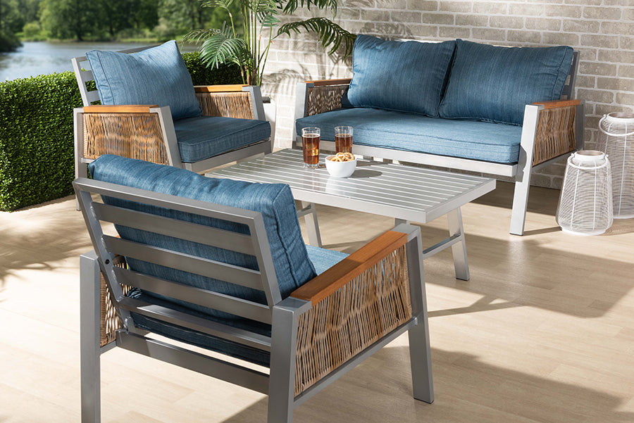 Baxton Studio Nicholson Modern and Contemporary Blue Fabric Upholstered and Grey Finished Metal with Brown Finished PE Rattan 4-Piece Outdoor Patio Lounge Set