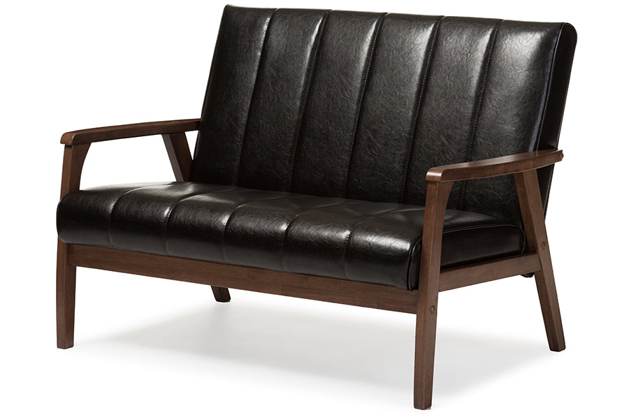 Baxton Studio Nikko Mid-century Modern Scandinavian Style Dark Brown Faux Leather Wooden 2-Seater Loveseat