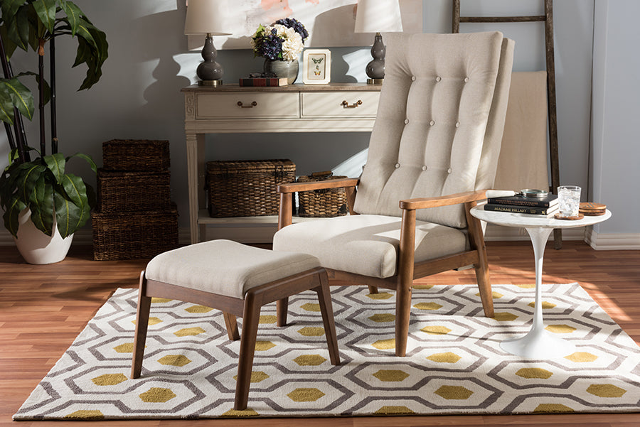 Baxton Studio Roxy Mid-Century Modern Walnut Wood Finishing and Light Beige Fabric Upholstered Button-Tufted High-Back Lounge Chair and Ottoman Set