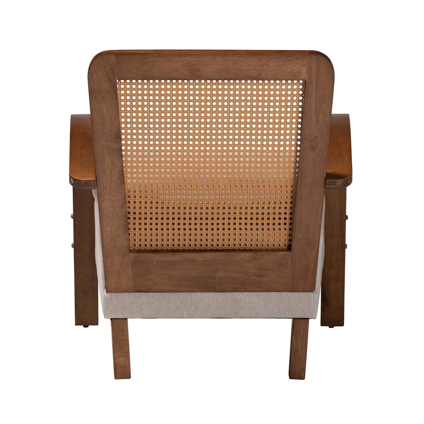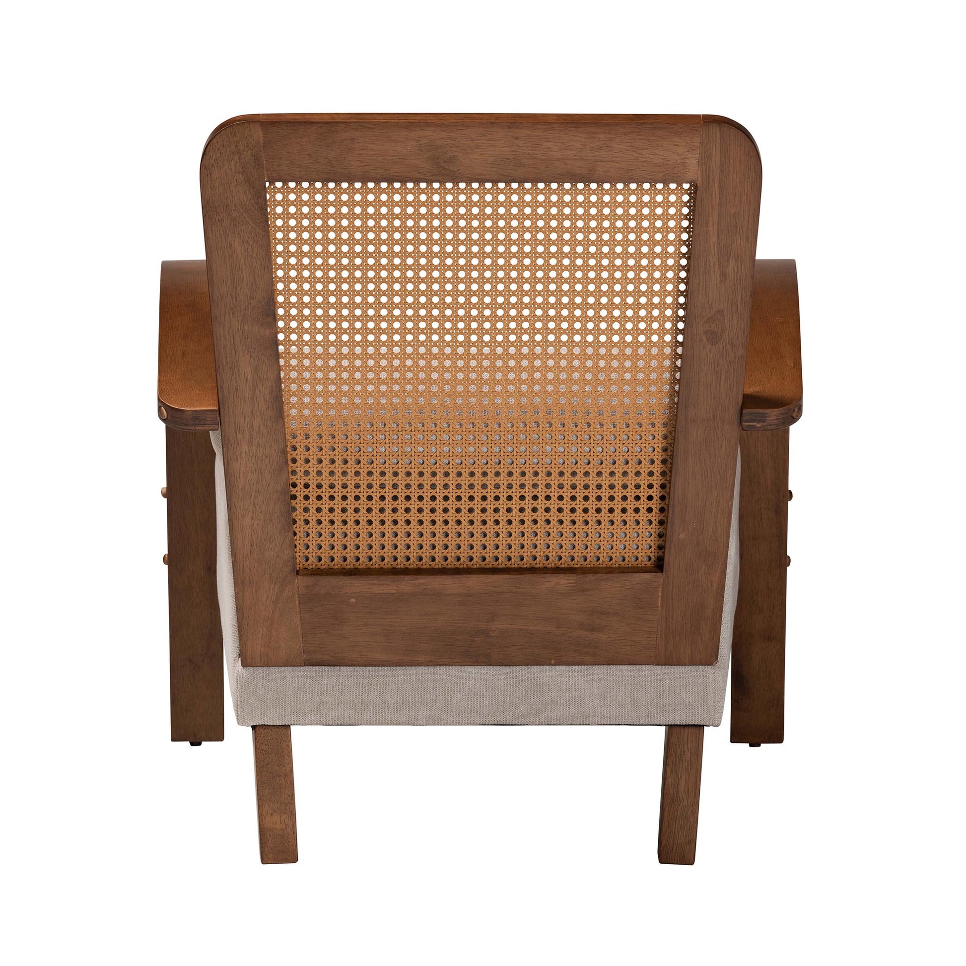 Baxton Studio Sage Modern Japandi Light Grey Fabric and Walnut Brown Finished Wood Arm Chair with Woven Rattan