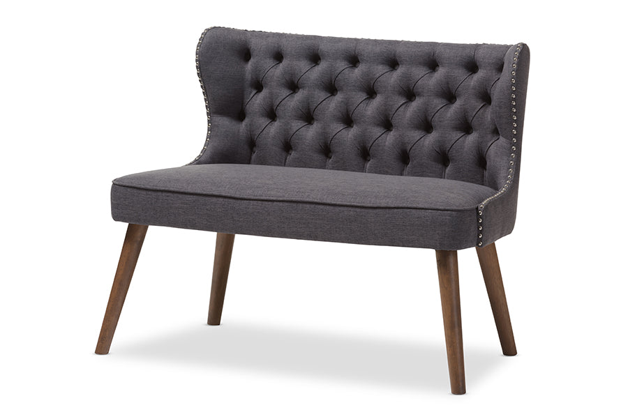 The Scarlett 2-seater loveseat settee is not the type of furniture to stay hidden in a corner. Channeling a brilliantly bold mid-century modern style, the Scarlett is a head turning design perfect for the modern home and commercial office. Silver nail heads trim around the sweeping curves of the backrest creating a welcome embellishment that accentuates the unique curved shape of its button-tufting backrest. Each element of the settee is not just stylish and up to-date, but also carefully sourced to ensure the highest production standards. The Scarlett loveseat is above all built for comfort and sturdiness. The inner metal frame provides a solid construction to support the webbed seat, while the medium density foam adds the soft touch that defines the most comfortable upholstery. Solidly supported by walnut rubber wood splayed legs, the Scarlett loveseat has been rigorously stress tested to make sure they hold their own through regular use. Stylish design meets everyday strength. A fully upholstered seat with exposed dark walnut wood looks great from all angles, whether in a lounge arrangement, public waiting area or private office. The splayed legs and button-tufting design add a retro modern touch to this piece of clean lines furniture. The Scarlett features light weight and easy handling. It will be suitable for those urban dwellers with limited space. It could be a cool-looking reading nook within 30 minutes of assembly out of a box. Made in Malaysia, the Scarlett requires assembly.